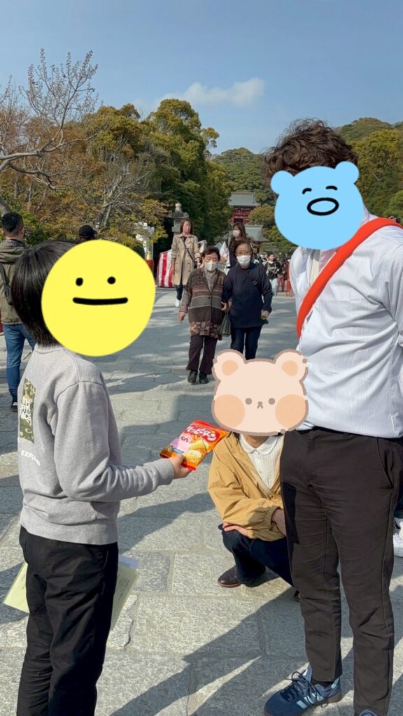 今年のミッションは、日本のお菓子を手渡しながらコミュニケーションをとることです。